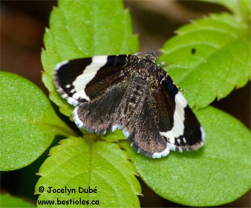 Ce sont des lépidoptères de couleur noirs, dont les ailes sont traversées par une bande blanche. On peut aussi voir que le bout des ailes antérieures porte un peu de blanc, et la frange des ailes postérieures aussi. Les ailes sont disposées à plat de chaque côté de lui quand il est posé sur une feuille. On peut le voir voler le long des sentiers et des cours d'eau où poussent les impatientes, qui sont les plantes hôtes de ses larves.
